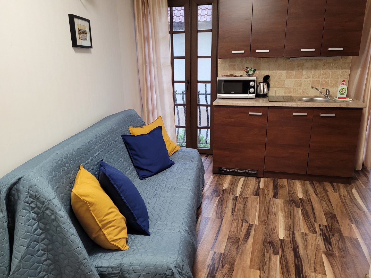 Komfortowy pokój studio z aneksem kuchennym, usytuowany na parterze tuż obok wejścia bezpośredniego na plażę i promenadę, z niezależnym wyjściem do ogrodu i własnym tarasem ogródkiem oraz częściowym widokiem na morze.