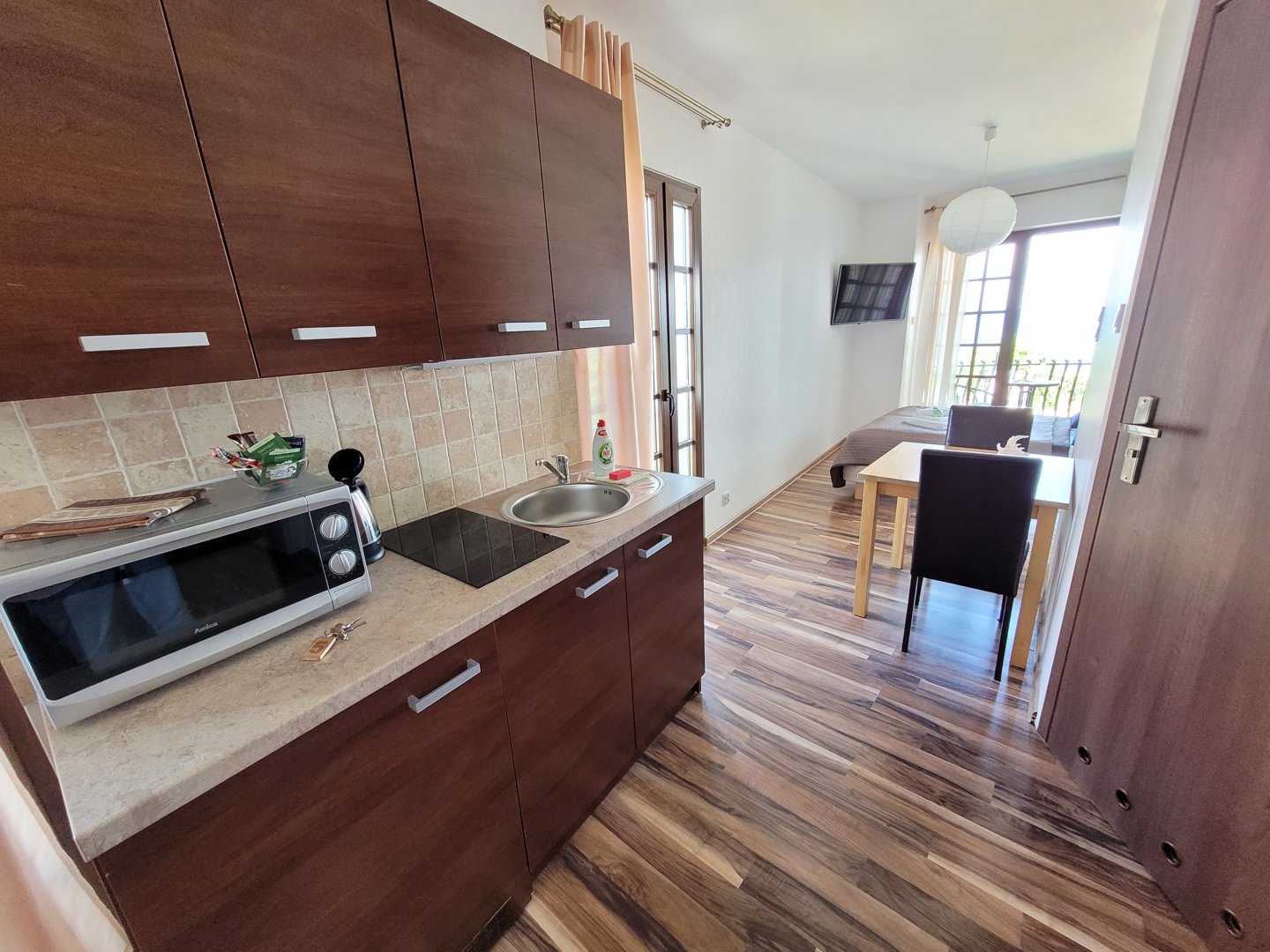Komfortowe studio 3-4 osobowy, o wysokim standardzie wykończenia, z w pełni wyposażonym aneksem kuchennym, TV LCD, internetem Wi-Fi, łazienką, balkonem. Wyposażony w szafę, stolik kawowy, kanapę rozkładaną w szerokie 2-osobowe łoże (150cm) oraz 2-osobową wersalkę (120cm).