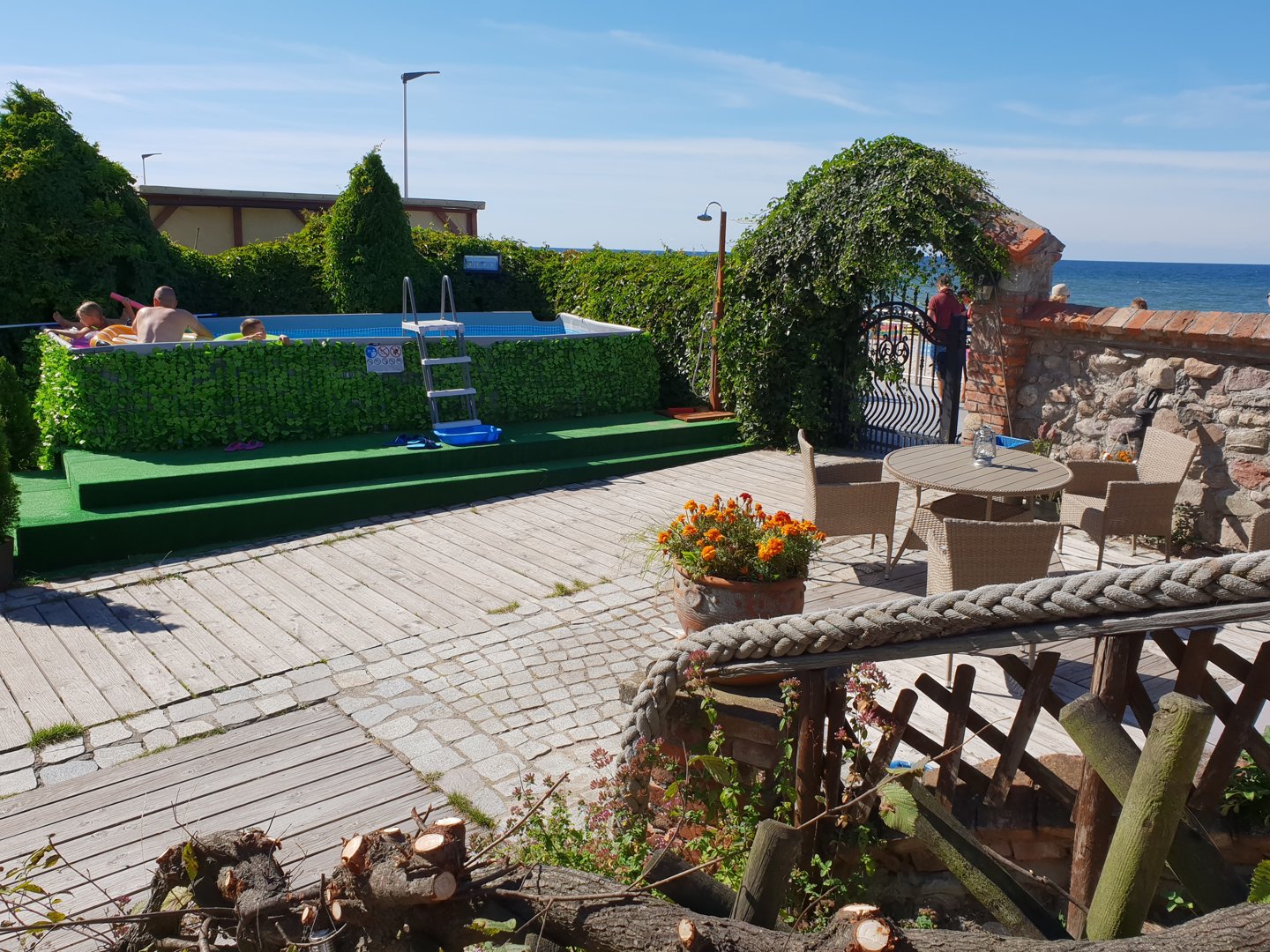 Komfortowy pokój studio z aneksem kuchennym, usytuowany na parterze tuż obok wejścia bezpośredniego na plażę i promenadę, z niezależnym wyjściem do ogrodu i własnym tarasem ogródkiem oraz częściowym widokiem na morze.