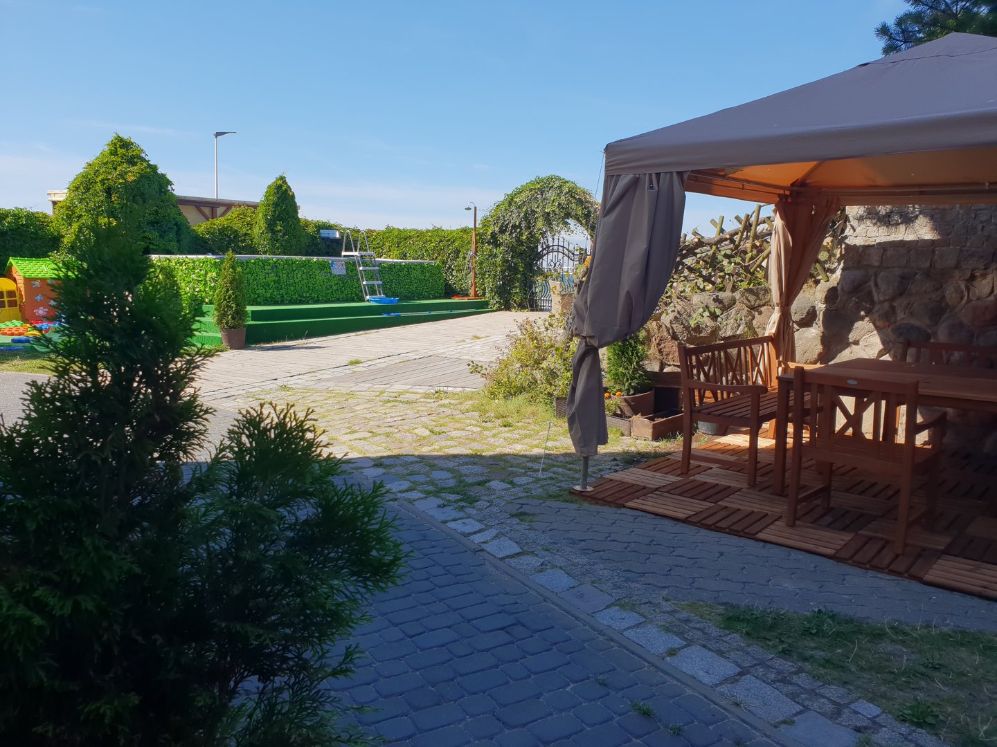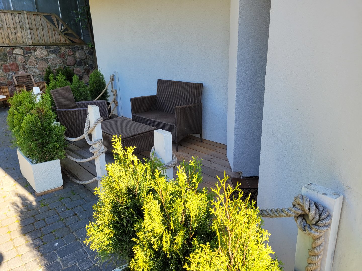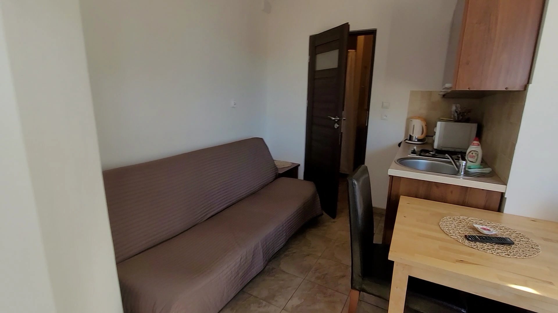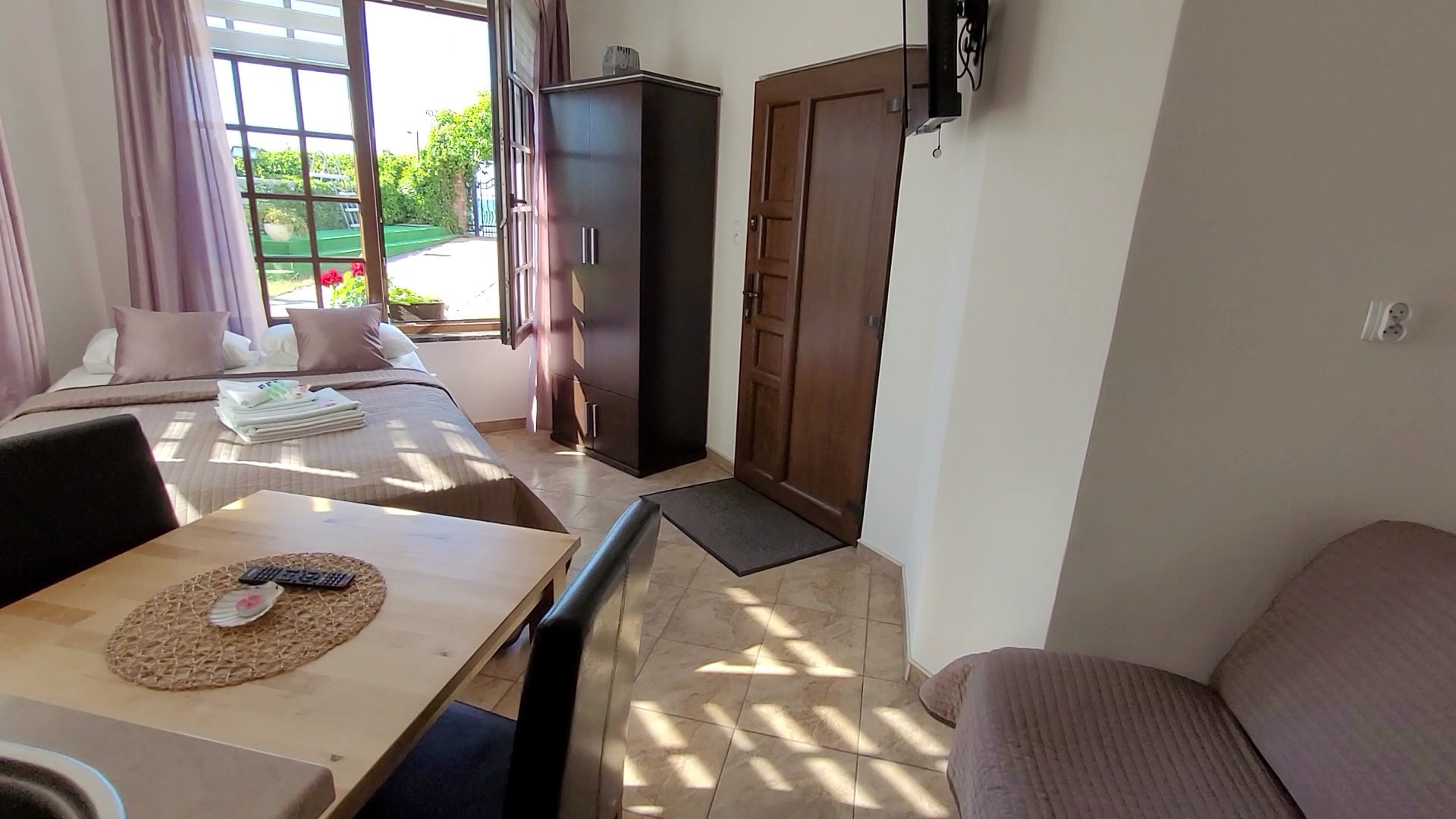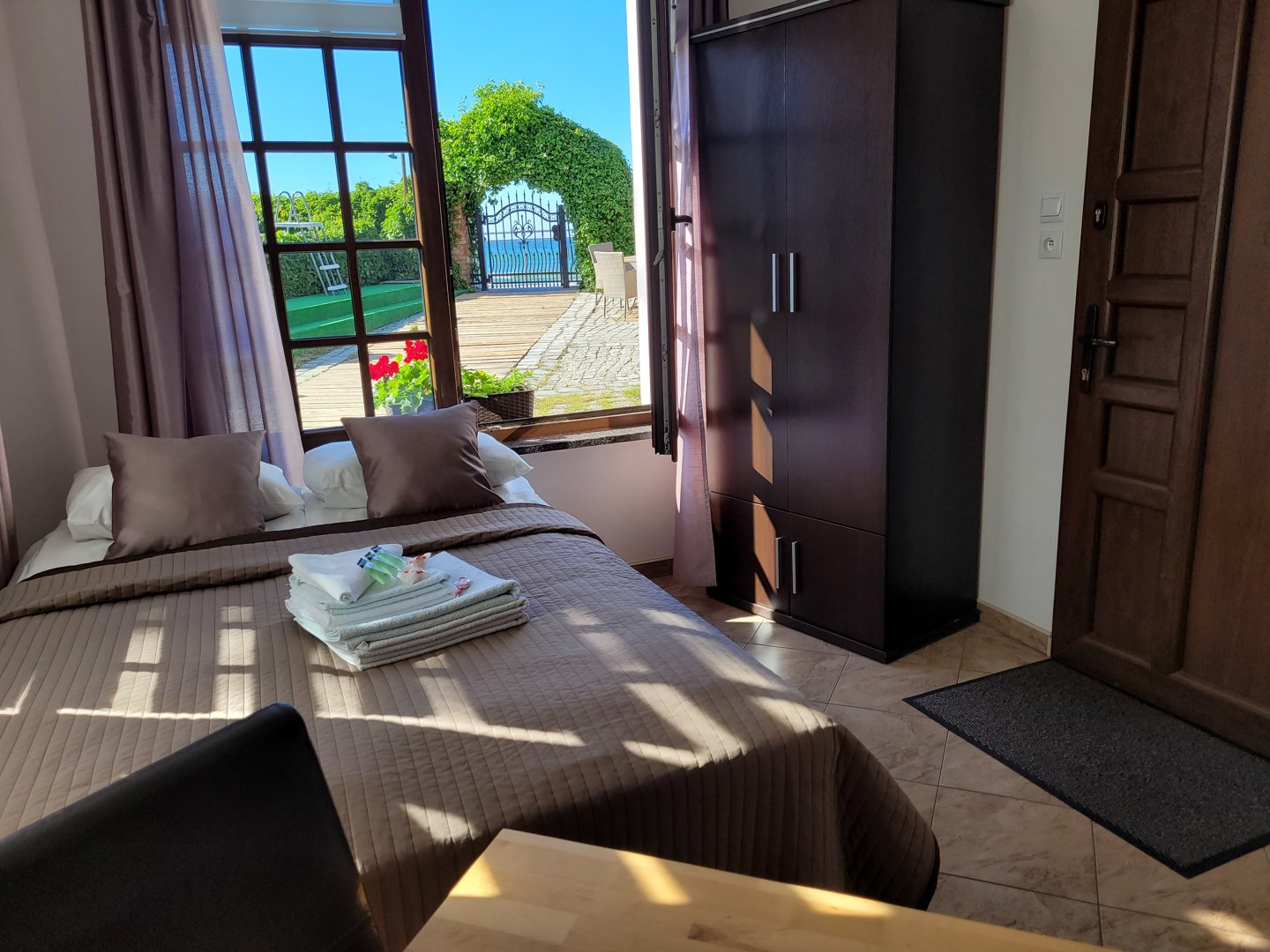 Komfortowy pokój 3-4 osobowy, z w pełni wyposażonym aneksem kuchennym, TV LCD, internetem Wi-Fi, łazienką, ogródkiem oraz indywidualnym wyjściem na posesję. Z pokoju przez okno i furtkę widać morze. Pokój wyposażony w szafę, stolik kawowy, kanapę rozkładaną w szerokie 2-osobowe łoże (150cm) oraz 2-osobową wersalkę (120cm). Aneks kuchenny wyposażony w kuchenkę mikrofalową z grillem, czajnik bezprzewodowy, kuchenkę gazową, lodówkę, sztućce, garnki, naczynia.