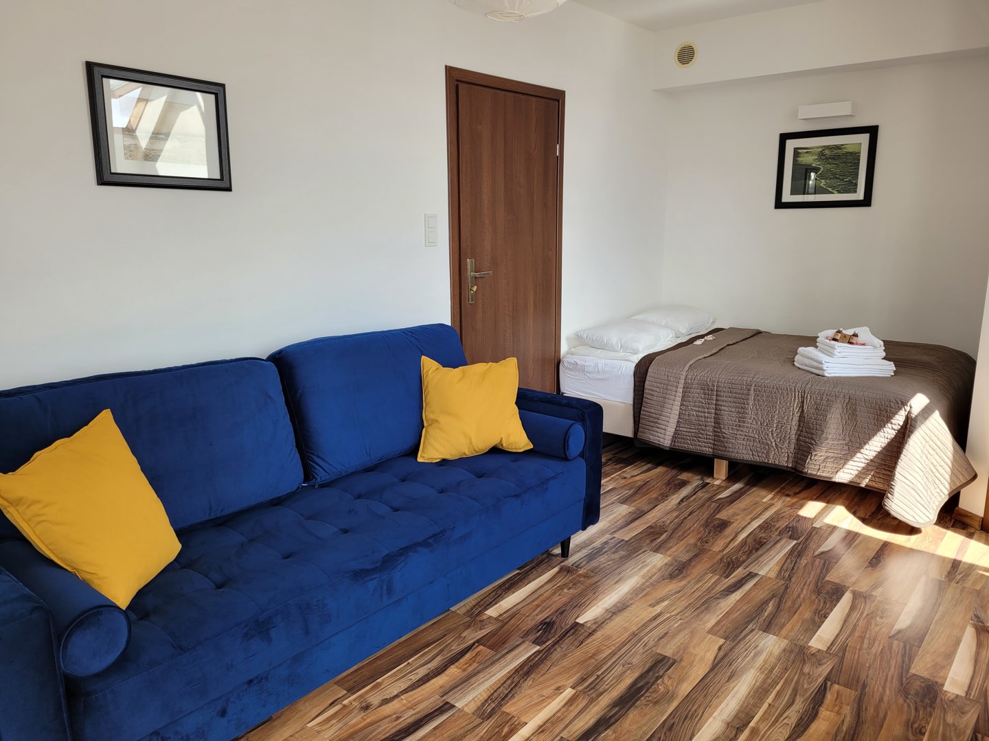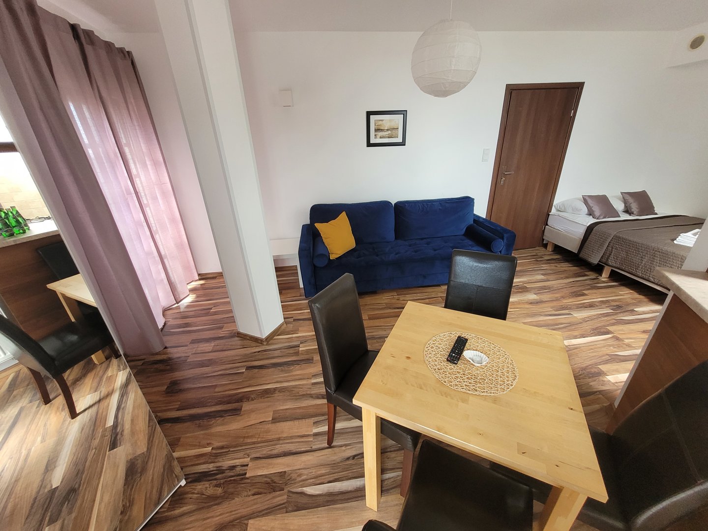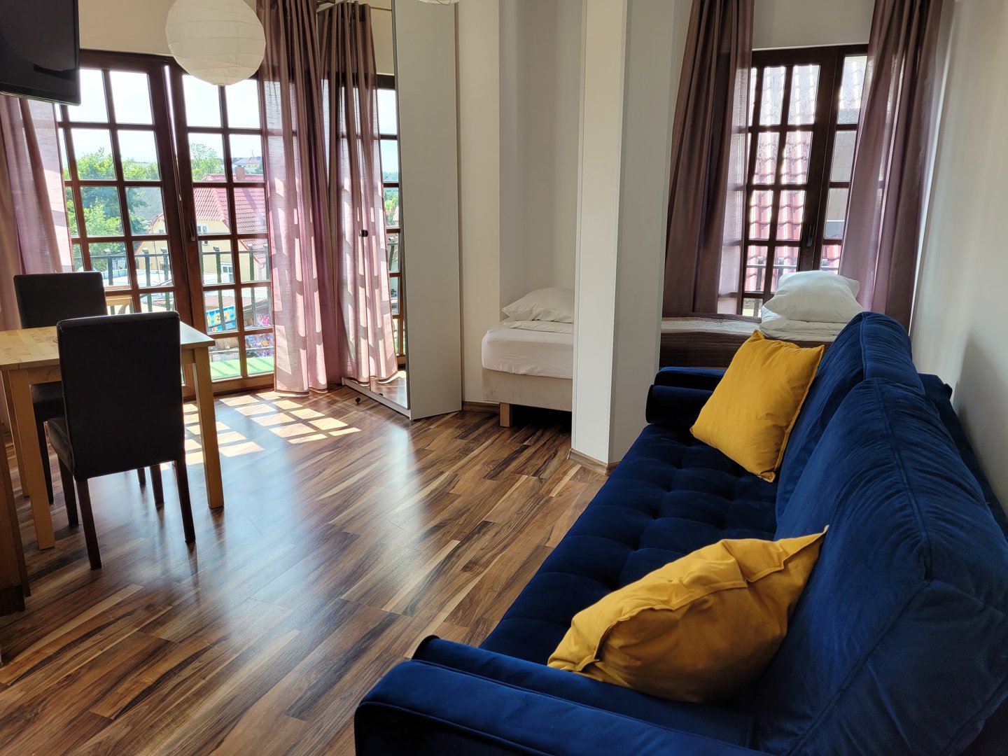 Dwuosobowe łoże, rozkładana dwuosobowa sofa, pojedyncze łóżko. Studio ma jeden balkon słoneczny narożny od strony ulicy oraz oraz balkon francuski z małym bocznym widokiem na morze.