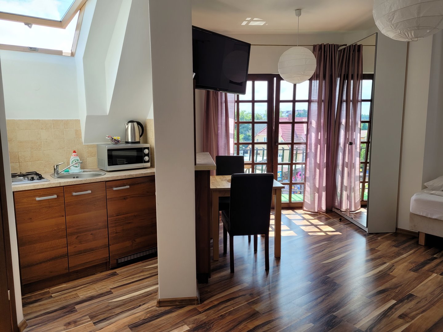 To studio z widokiem na ulicę z w pełni wyposażonym aneksem kuchennym. Doskonała opcja dla rodziny 2+3