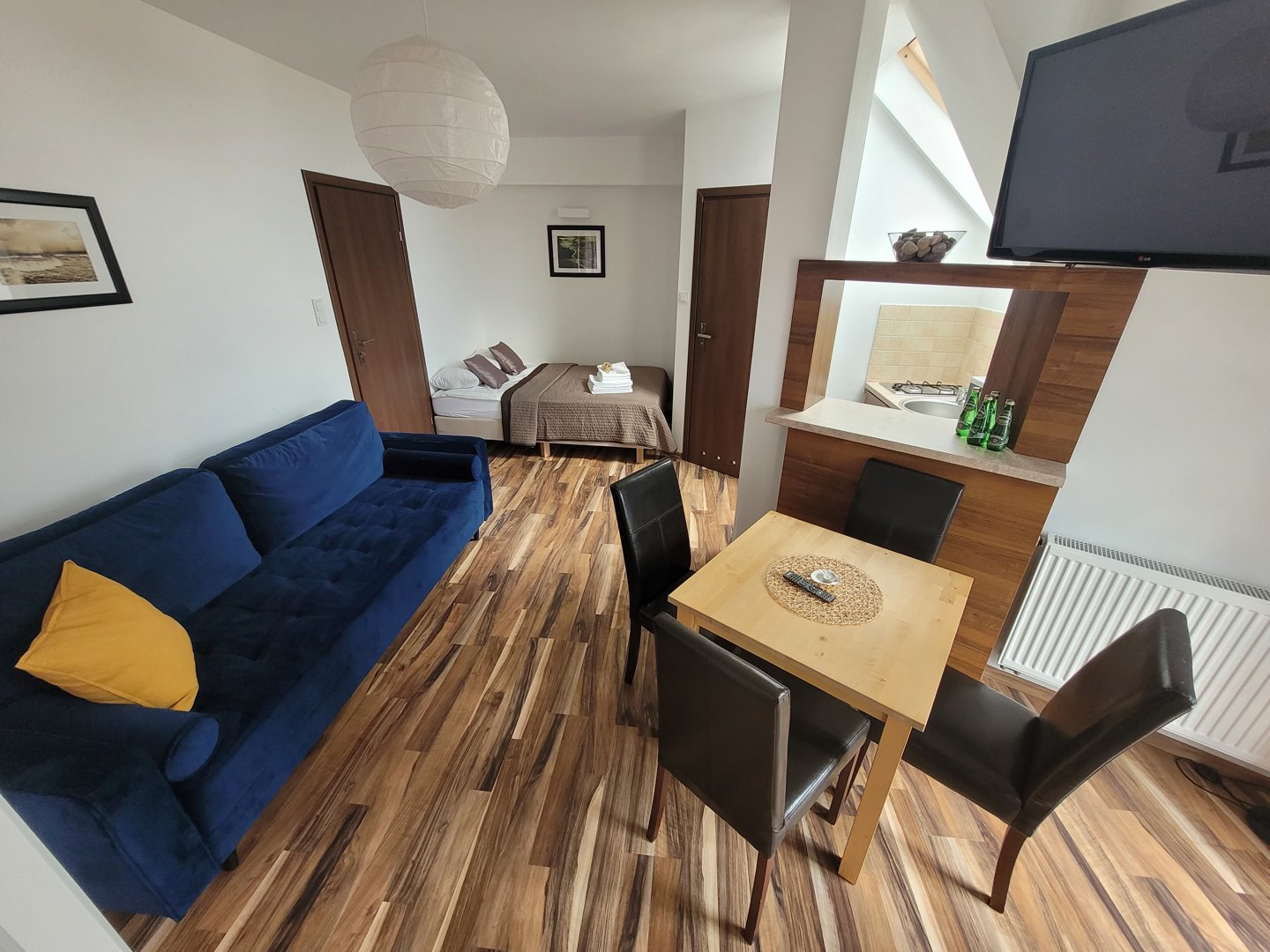 studio z aneksem kuchennym i bocznym widokiem na morze