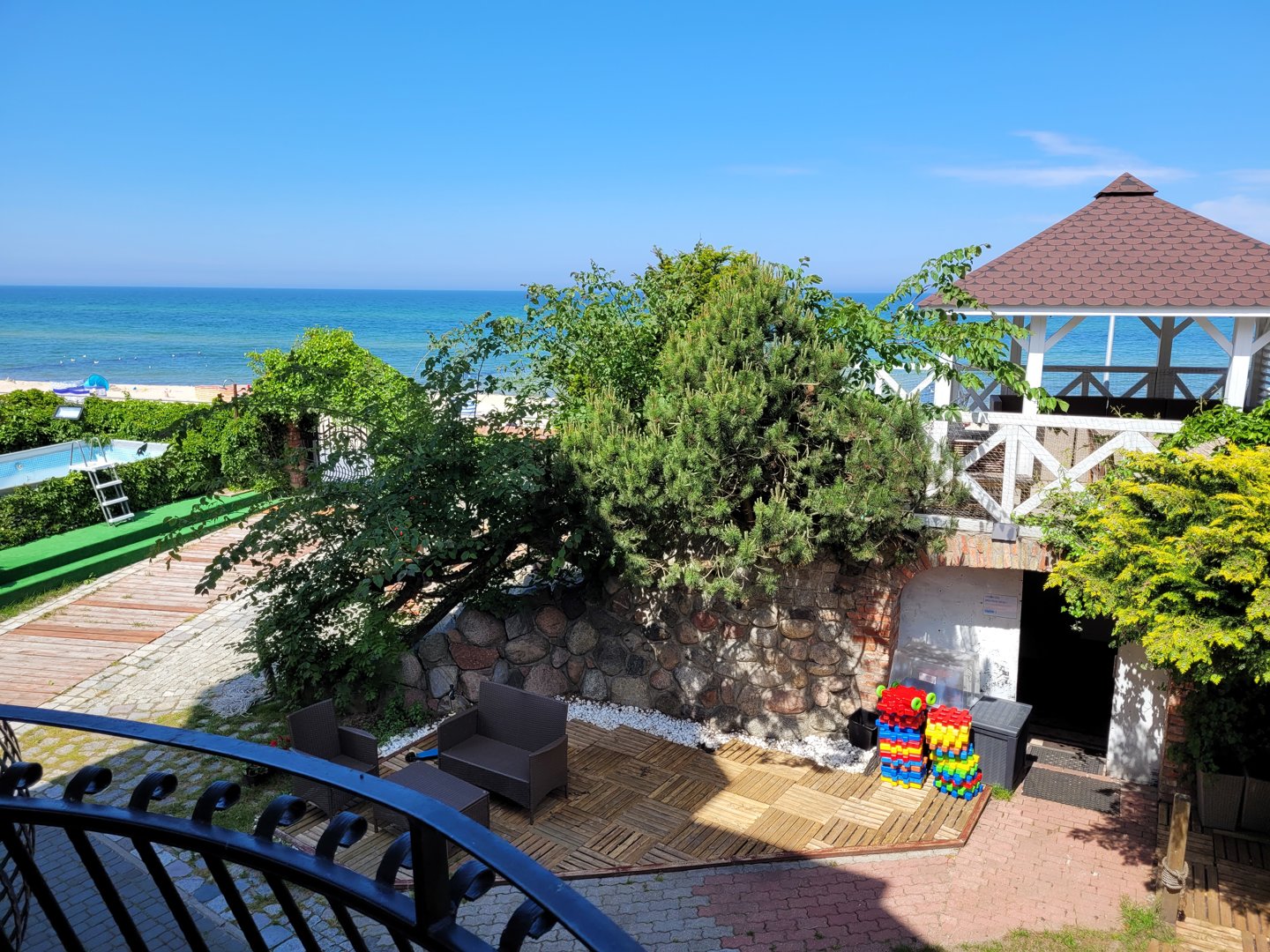 Komfortowy pokój studio z aneksem kuchennym, usytuowany na parterze tuż obok wejścia bezpośredniego na plażę i promenadę, z niezależnym wyjściem do ogrodu i własnym tarasem ogródkiem oraz częściowym widokiem na morze.