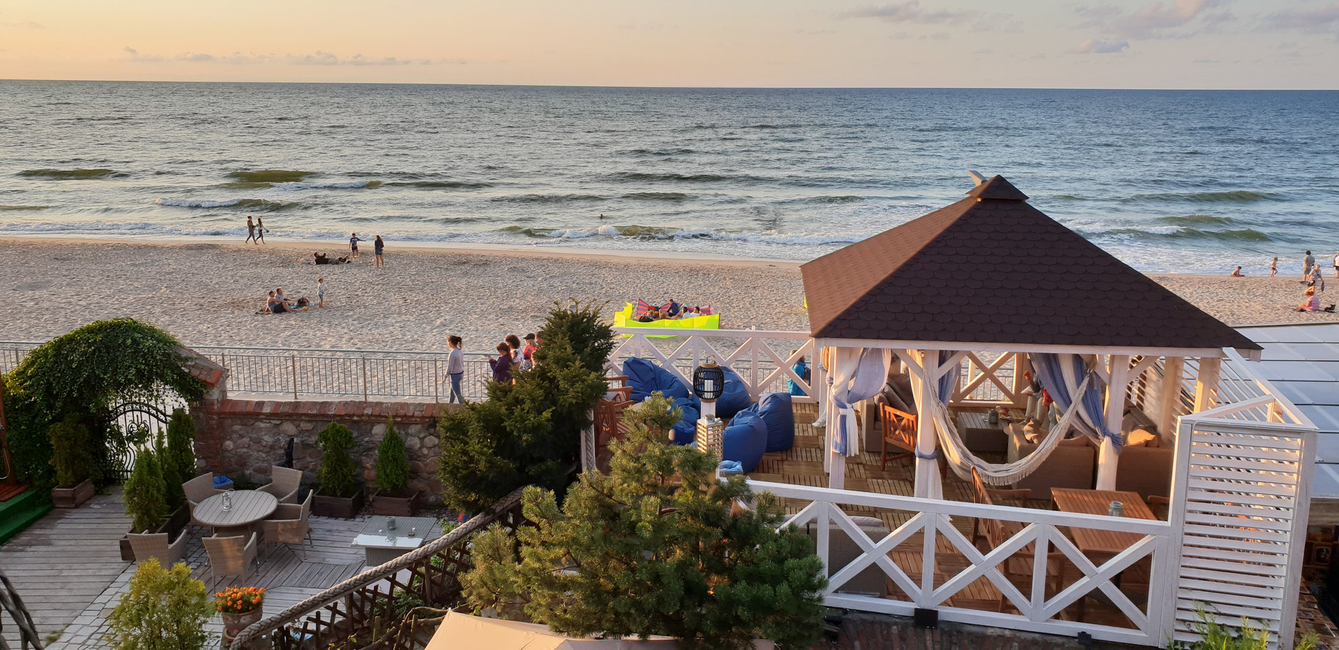 Komfortowy pokój studio z aneksem kuchennym, usytuowany na parterze tuż obok wejścia bezpośredniego na plażę i promenadę, z niezależnym wyjściem do ogrodu i własnym tarasem ogródkiem oraz częściowym widokiem na morze.