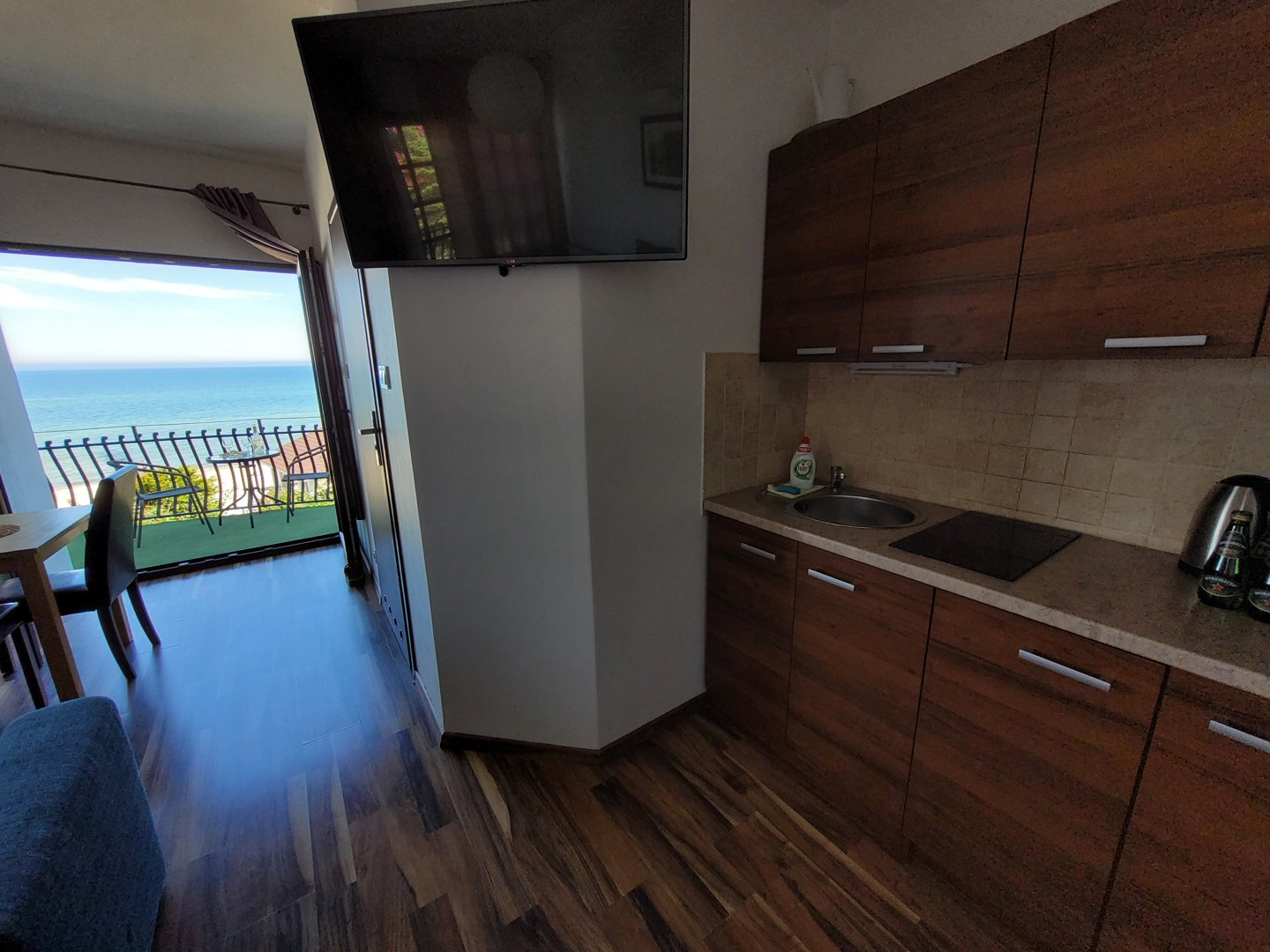 studio z aneksem kuchennym i bocznym widokiem na morze