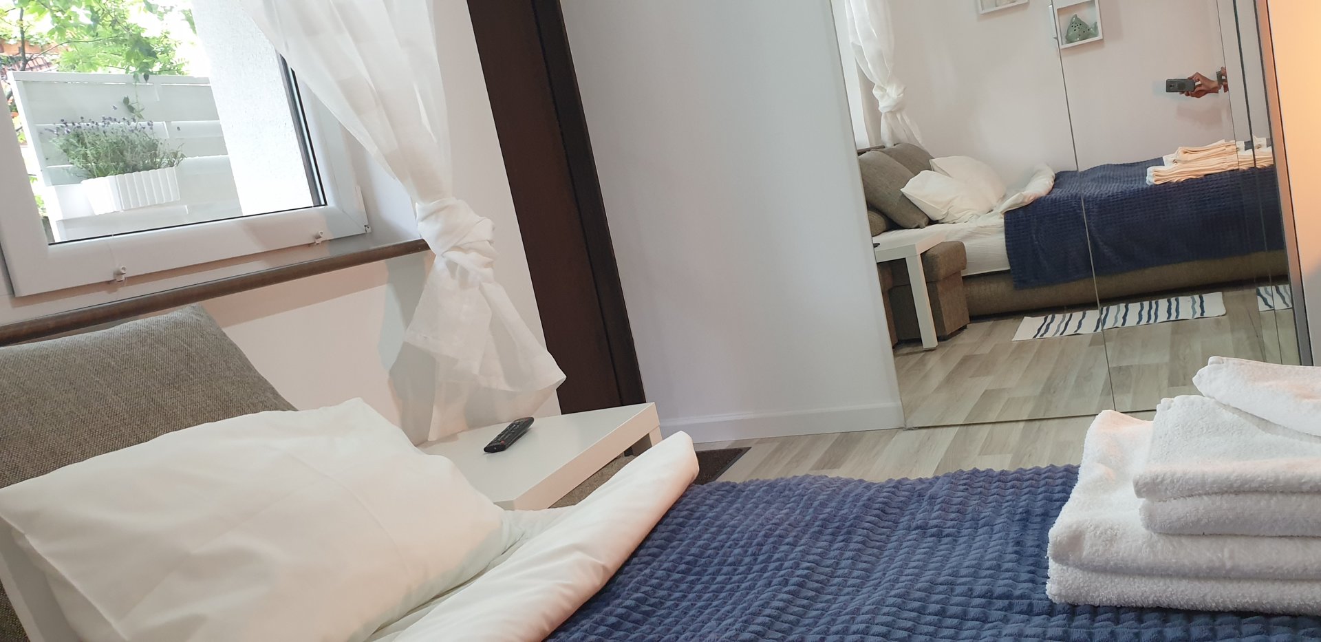 Malutki, ale przytulny pokój 2-osobowy usytuowany na parterze od strony wschodniej, z indywidualnym wyjściem na posesje oraz z własnym przytulnym ogródkiem. Wyposażony w łazienkę, TV, szafę, lodówkę, czajnik, kuchenkę mikrofalową wygodną oraz kanapę rozkładaną w wygodne szerokie (150cm) łoże.