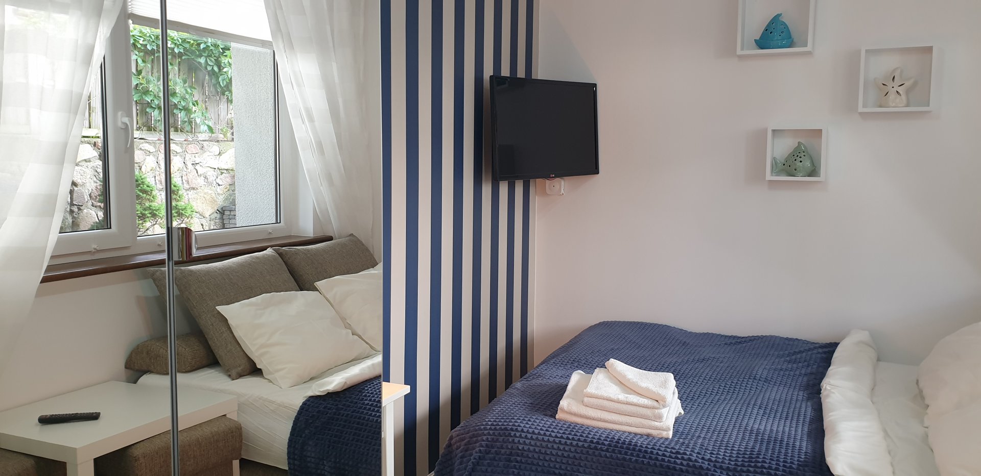 Atutem pokoju jest indywidualne wyjście do ogrodu,mały prywatny ogródek/weranda oraz bliskość przestronnego tarasu wypoczynkowego z panoramicznym widokiem na morze co rekompensuje na pewno małe gabaryty pokoju.